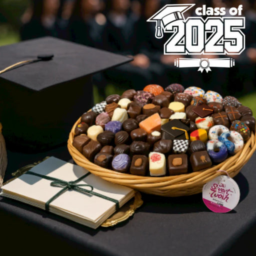 🎓 Honor their big day with a graduation chocolate gift basket they’ll never forget. This small round box includes 27 handcrafted chocolate treats...